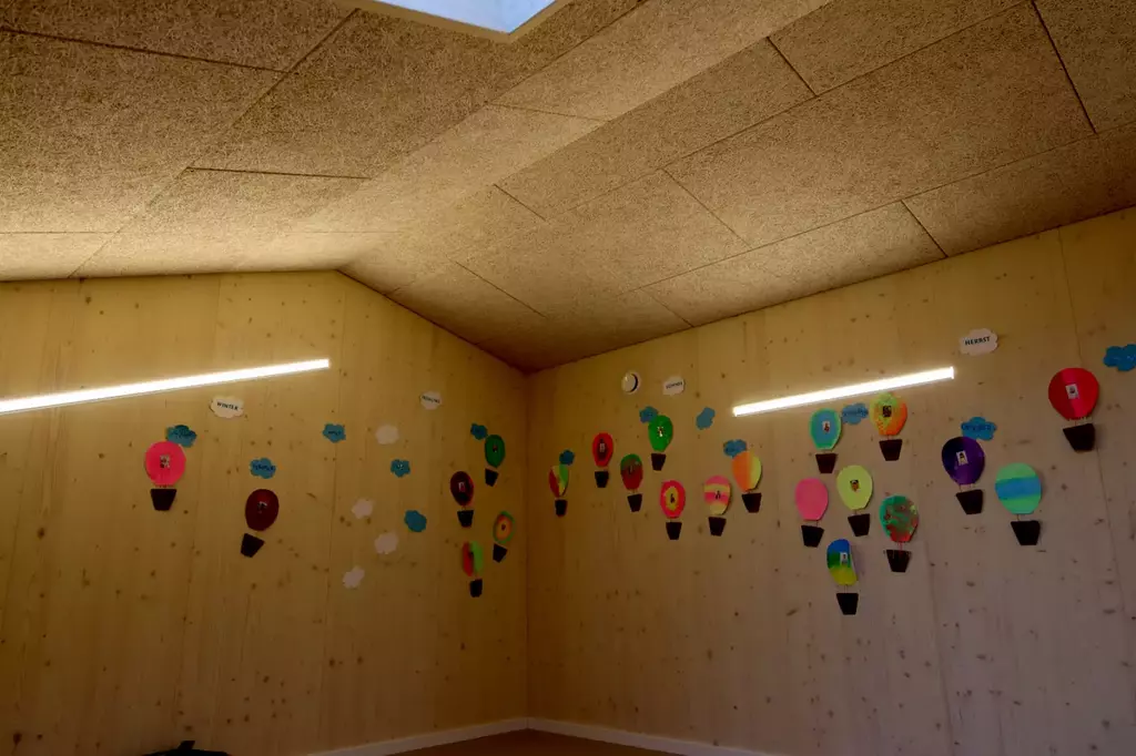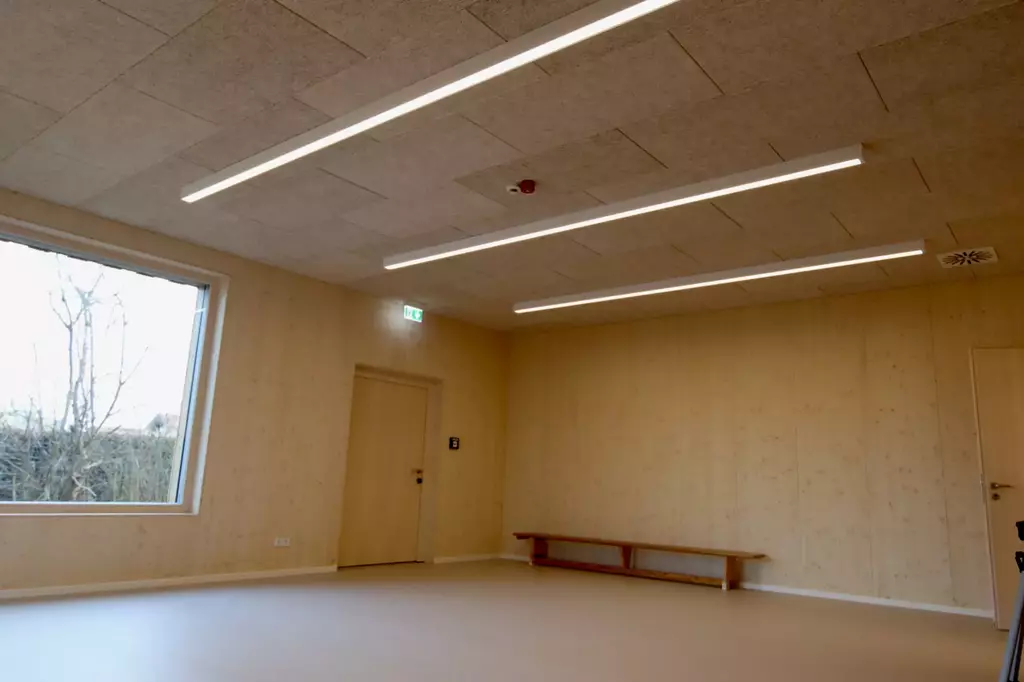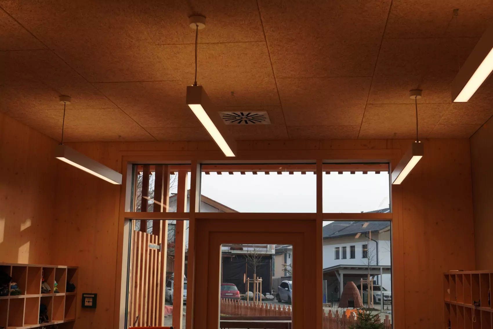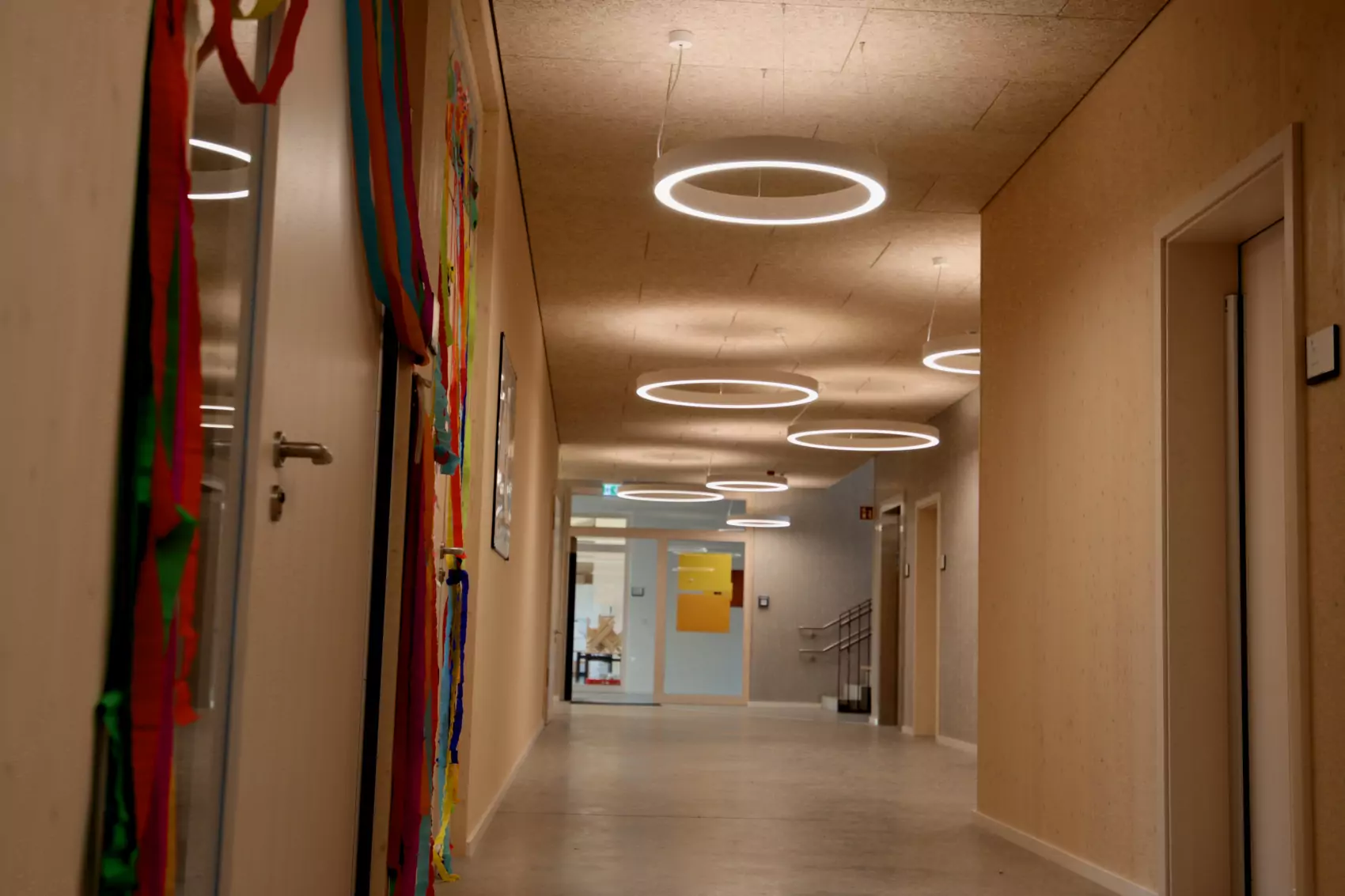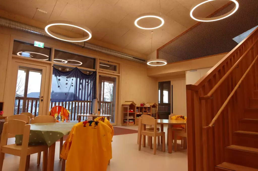Die Beleuchtung in den Gruppenräumen wurde speziell für Kinder konzipiert: blendfrei, altersgerecht und funktional. Für die Sicherheit sorgen eine Brandmeldeanlage, Sicherheitsbeleuchtung sowie eine umfassende Blitzschutzanlage.